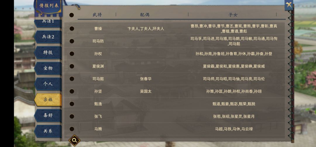 曹操13,司马防8,孙权8,孙坚6,夏侯渊5,司马懿5,甄逸5,马腾4,韩德4,曹真4,卞夫人4,孙静4,士燮4,刘备4,关羽4,张飞4个。 (史实个数一般比这个要多,这只是游戏里存在的子女武将个数)🐵🐵🐵