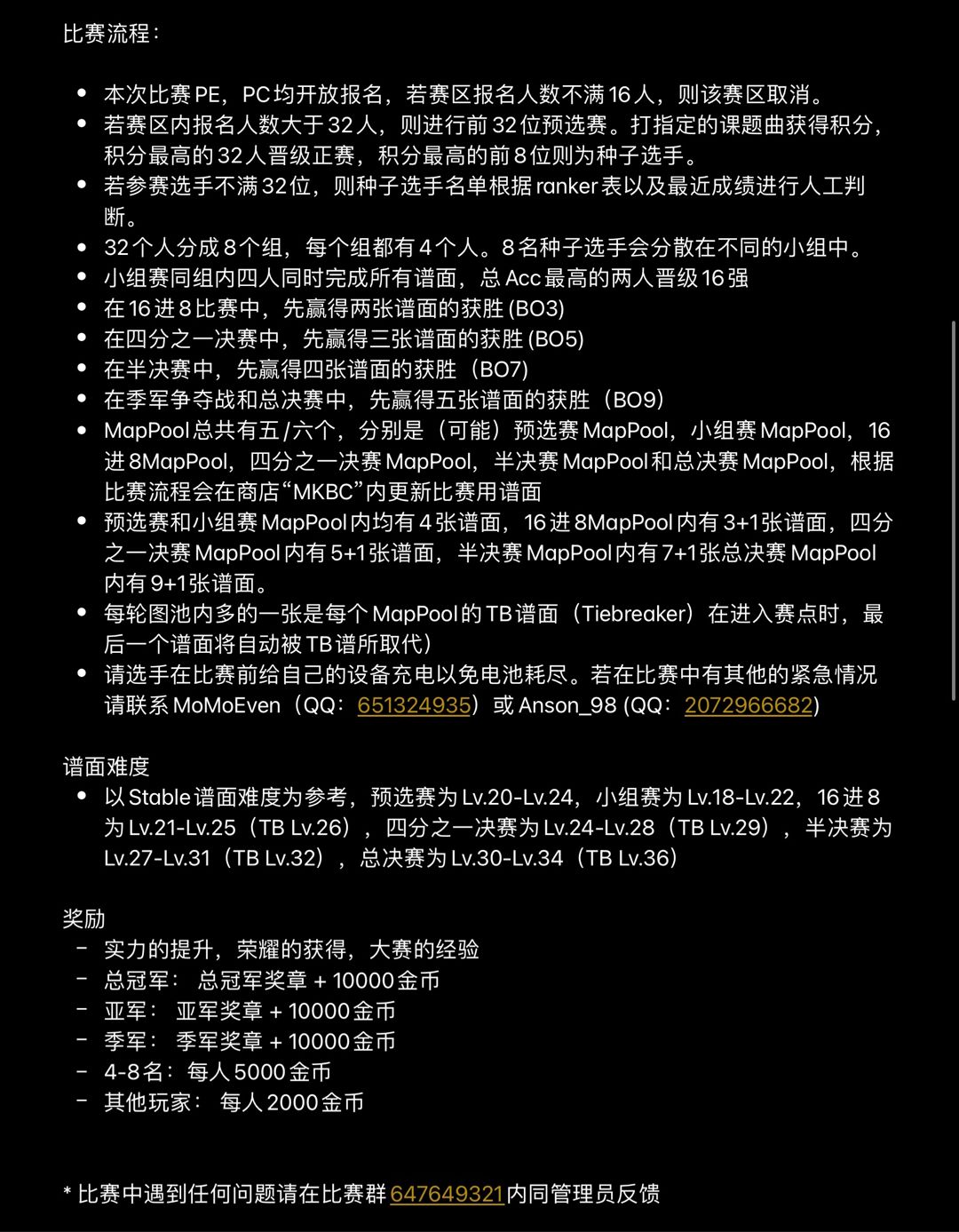 单人即可提前完成报名,PC,PE玩家均可报名!报名选手必须是Malody 4K v3 9dan以下(不包含9dan)。若估计不打/虚报实力者将会被禁赛。任何时段曾达到过Malody 4K v3 9dan及以上的玩家均不可报名(不接受长时间没玩水平掉落的原因)