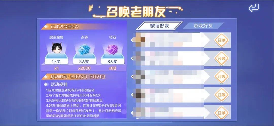 截止至7月21日,参与限时活动【召唤老朋友】召回指定好友人数即可获得头发&点券*2000&钻石*88!