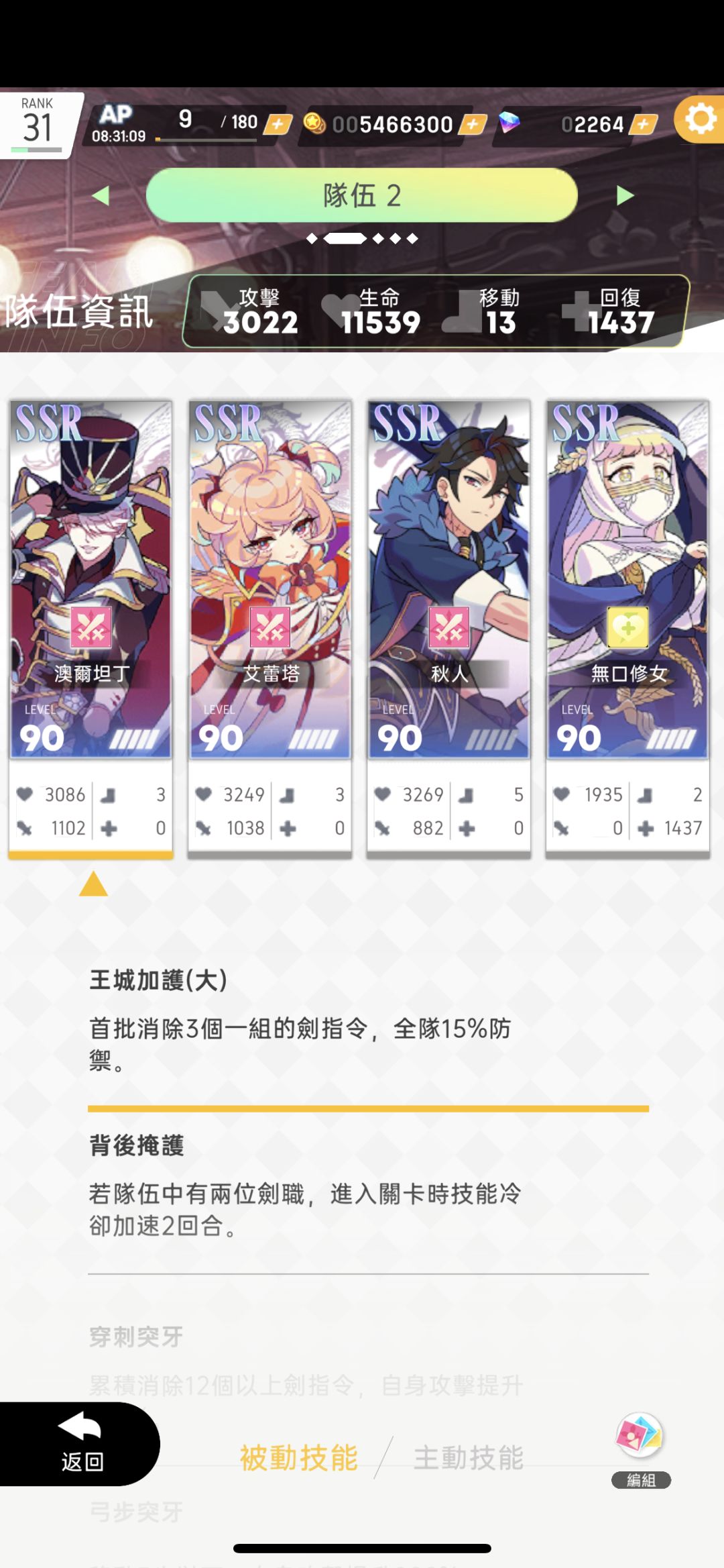 二号女天剑主动技能加满开场可放,25回合cd25回合持续时间,无缝衔接加成剑卡片的出现几率,纯剑职必拿,而且五消剑卡可以变aoe(这个被动实际体验并不好,首先要五消不多不少,其次天剑伤害有限,但谁让她大招和被动生成剑卡很有用呢)