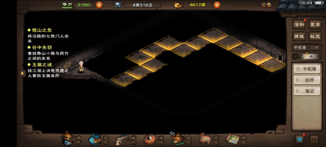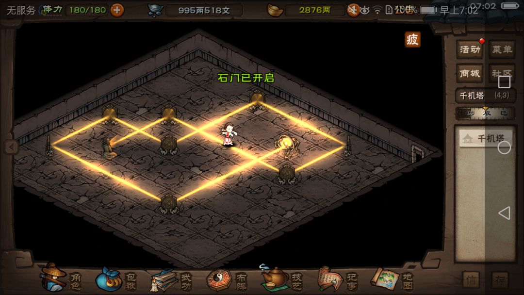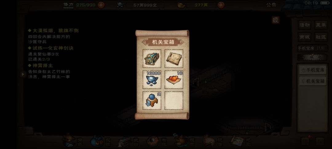 活动开启9天,一共有三个宝藏:机关鸟-定时起床,机关关节-强化傀儡,黑铁机关臂-强化孟翔,附带丹药和银两。通关三次可以全部获得,难度递增。
