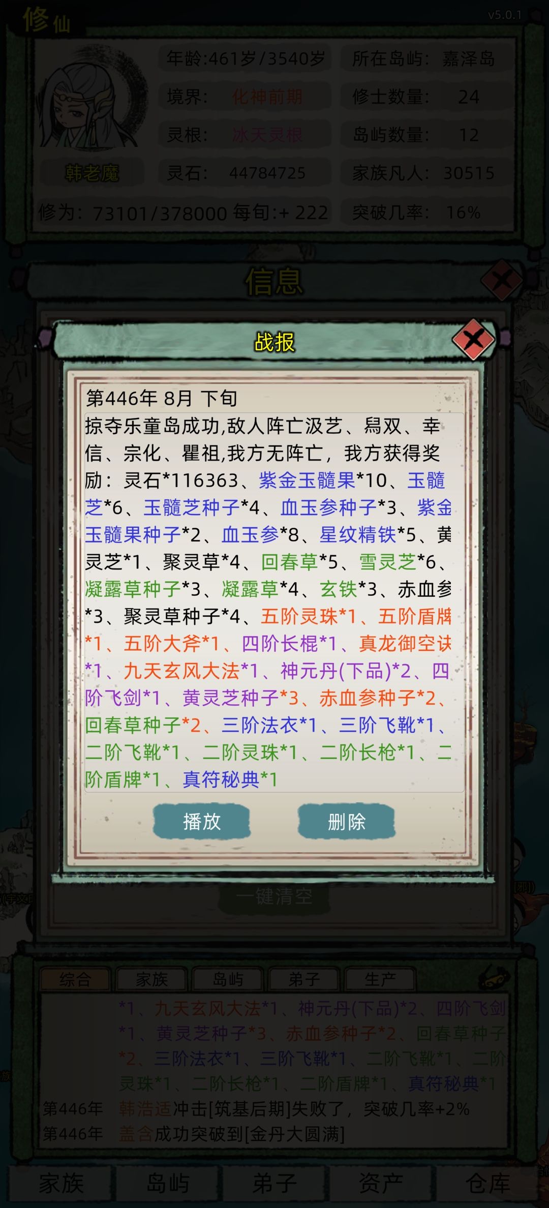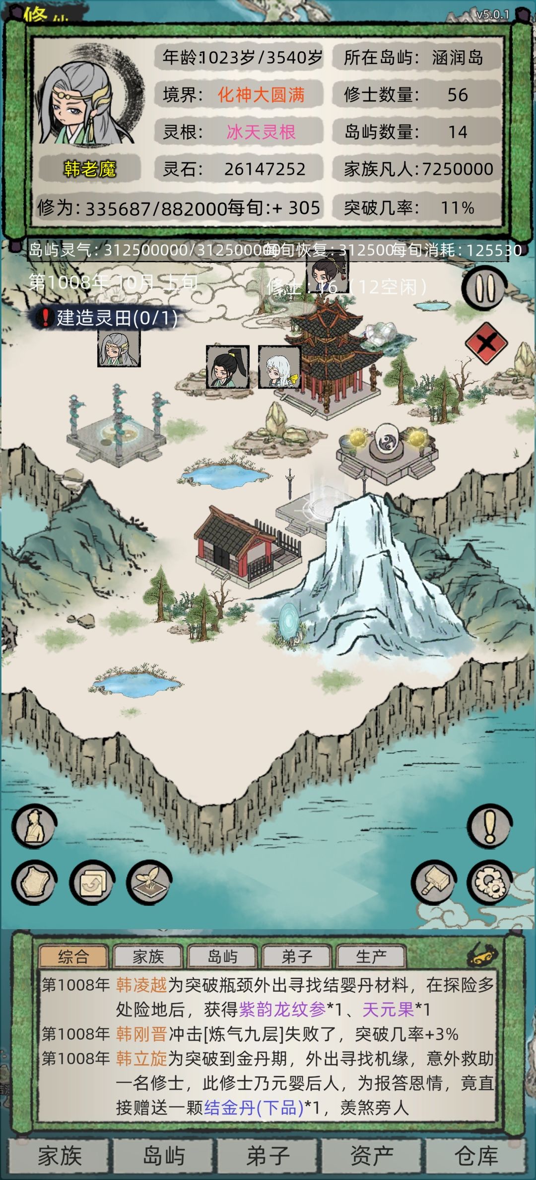 刷个盾直接A拆了灵脉跑路回家升级我们的小岛灵脉出天道台上聚灵阵 一直三倍速 中间忘了截图了 元婴期就可以出去拿几个大岛灵脉了
