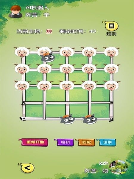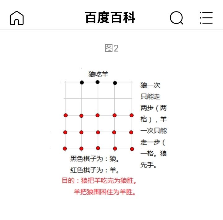 2狼可以吃羊,羊不能吃狼,但狼吃羊必须是隔一个格子才能吃,被羊贴身了狼就不能往那个方向走了,如果四面都被羊贴身了狼就不能动了,三个狼棋子都不能动视为羊赢,羊被吃光视为狼赢。
