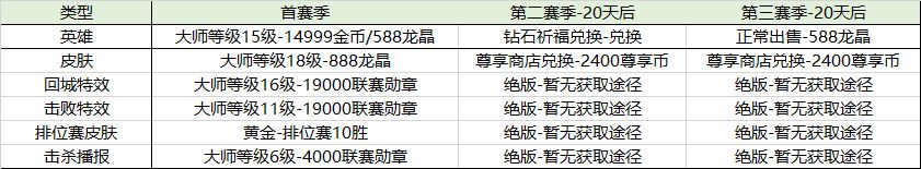 回城特效、击败特效、排位赛皮肤、击杀播报,暂时只有首赛季才有机会获取。获取条件见表格,这里就不赘述了。