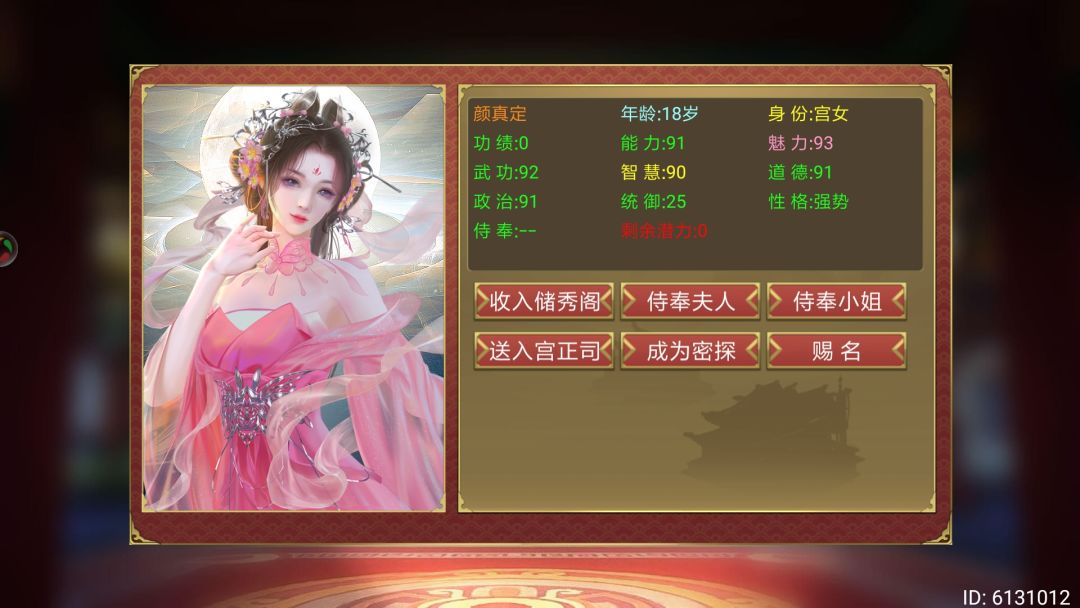 开局妃子卡带牛郎织女(织女保证皇后选秀必有明妃,牛郎保证招募概率名臣明妃) 上朝开征辟制(只需要那个+10%名臣概率,对明妃有效) ,这样1.7月一品楼和4.7.10月云湖渡就不用刷那么多次了随从最多一次招3个并且还有潜力可以加(配合其他策卡加随从潜力,五行拿个加潜力的buff更好) 高属性名臣明妃(密探)随便刷几次就好了