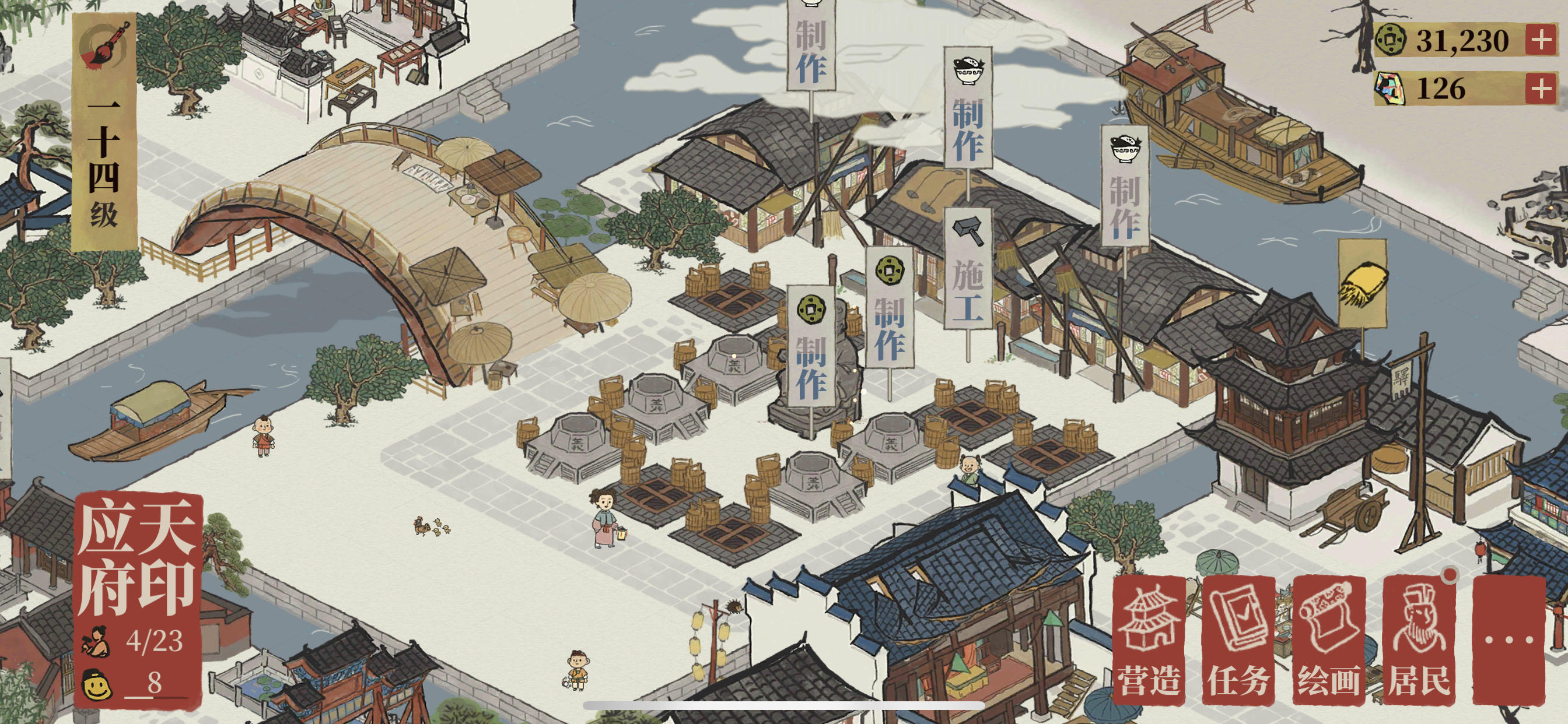 所以基本雕像的buff没有很严谨 我按照生活方式安排的 第一个是我布置了一个商业街 一进城门两面都是商铺 穿过集市左边也是商业 戏台和地摊