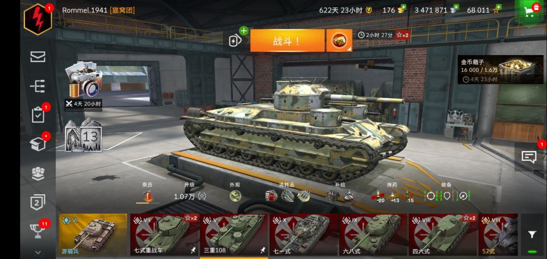 关于上面提到的日系八级金币车五七式,个人体验了很多场,只能表示这辆车很依靠队友和运气。他装备的127mm战车炮高低伤不稳定,装甲比较迷,不同于日系线车,比较依靠快速瞄准来取得先手优势。对于新人,不建议使用。
