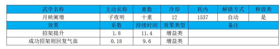 不难看出,月华剑法的收益主要来源于两个技能的消内和寒月逐的附伤buff。虽然本身平砍很低,但如果加上寒月逐的附伤buff,平砍可以达到九龙鞭法的水平。对消内技能来说,如果战斗结束对方还没有空内,那收益就是0,所以配队要点是保证自己活到对方空内,之后依靠寒月逐的附伤buff提高伤害,对没有技能防御的对手实现反杀。具体搭配将在本文结尾处讨论。