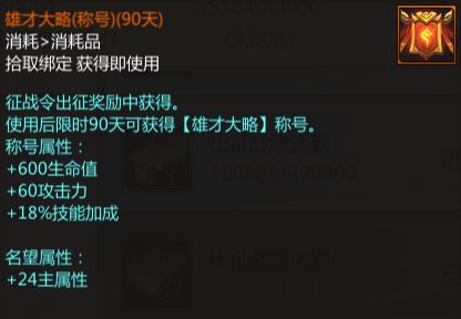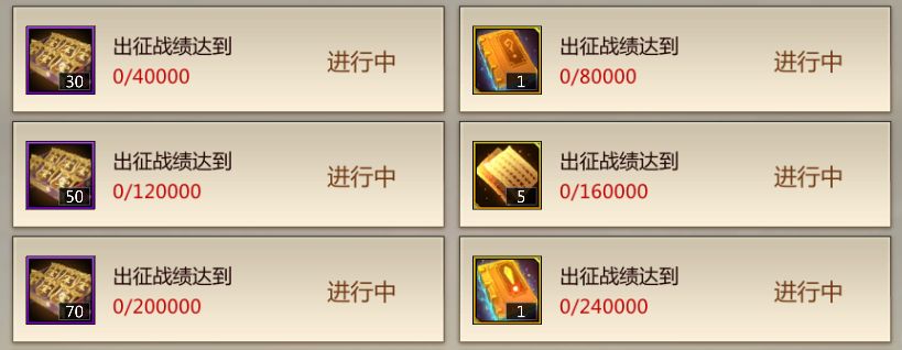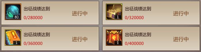 出征战绩达到280000时可以直接获得修习丹*80,达到320000时可以直接获得1w军功;出征战绩达到360000时可以获得自选四级镶嵌卡册(30天),达到400000时可以获得称号雄才大略(90天)。