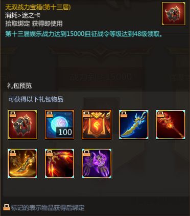 征战令等级达到48级且战力达到15000或官渡等级达到震古烁今五阶则可分别获得无双战力宝箱(第十三届)和官渡段位宝箱(第十三届)。