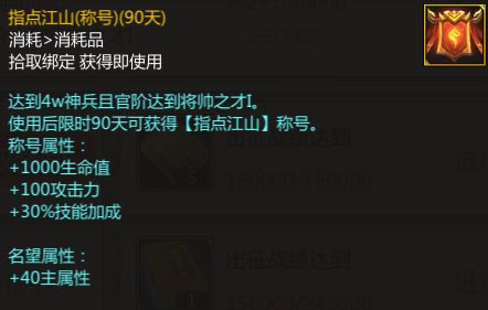 其中包括2w军功,元神徽章自选礼包和指点江山(称号)(90天)。