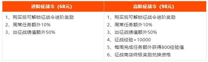 注:解锁了进阶征战令的玩家在结算出征战绩时会获得加成,可以更快的提升出征战绩哦。