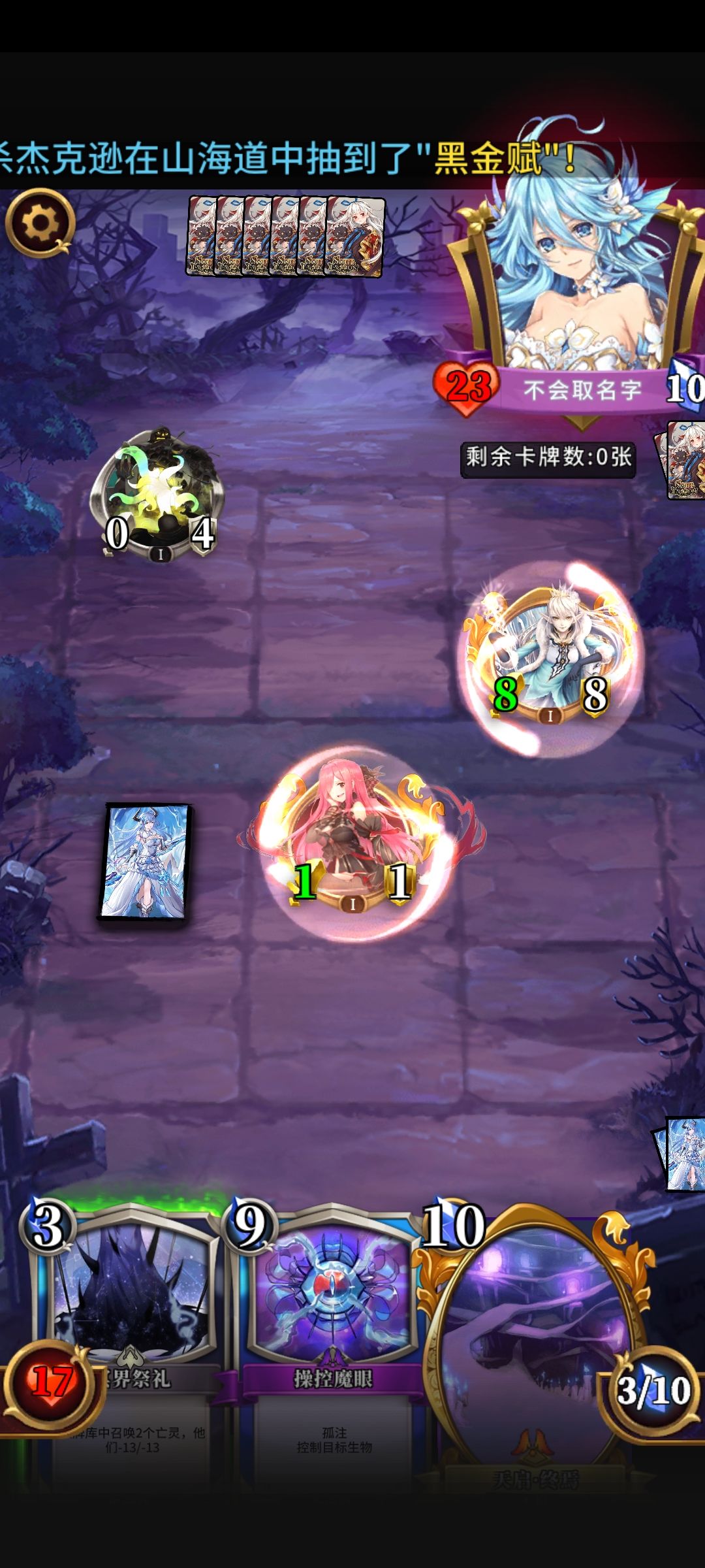 对面牌库空了三四回合的样子,我还用了崩坏给对面叠疲劳,最后他自己一个饥荒成功自杀