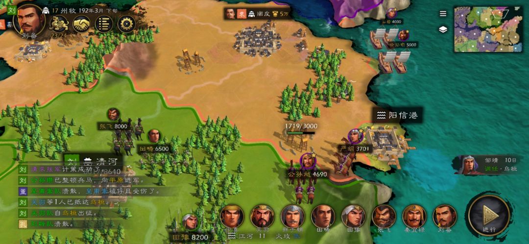 与公孙孙瓒商定讨伐袁绍,分三路向南皮进军,一路刘备领25800精锐从涿郡南下进攻,一路张飞领30100精锐从清河北上进攻,一路盟友公孙瓒领18000兵士从水路夺下阳信港后支援张飞,我军及盟友共计额73900兵力,但不想公孙老贼背信弃义,一登上岸便跳转枪头,直取我方平原,我随即大怒,瞬间关闭游戏睡觉。