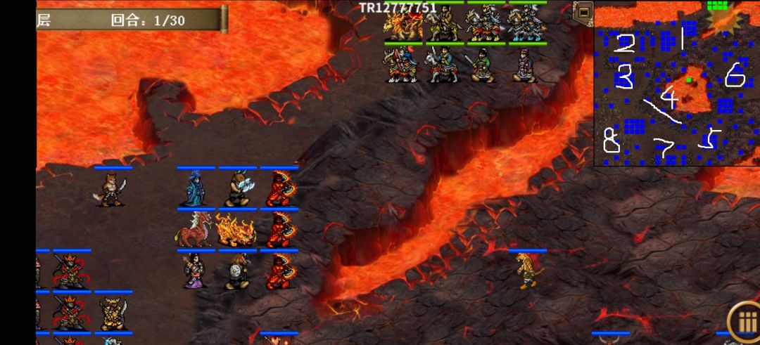 4.刘备、浮生、马超、诸葛,紧贴中央火池边缘,顺着 4 号白线走,在走的过程中继续清理小怪和第七部分师徒四人。孙乾在第二部分原地待命。如果不顺着4 号白线走,会在地图最左侧也就是第八部分触发不停复活的两波伏兵。