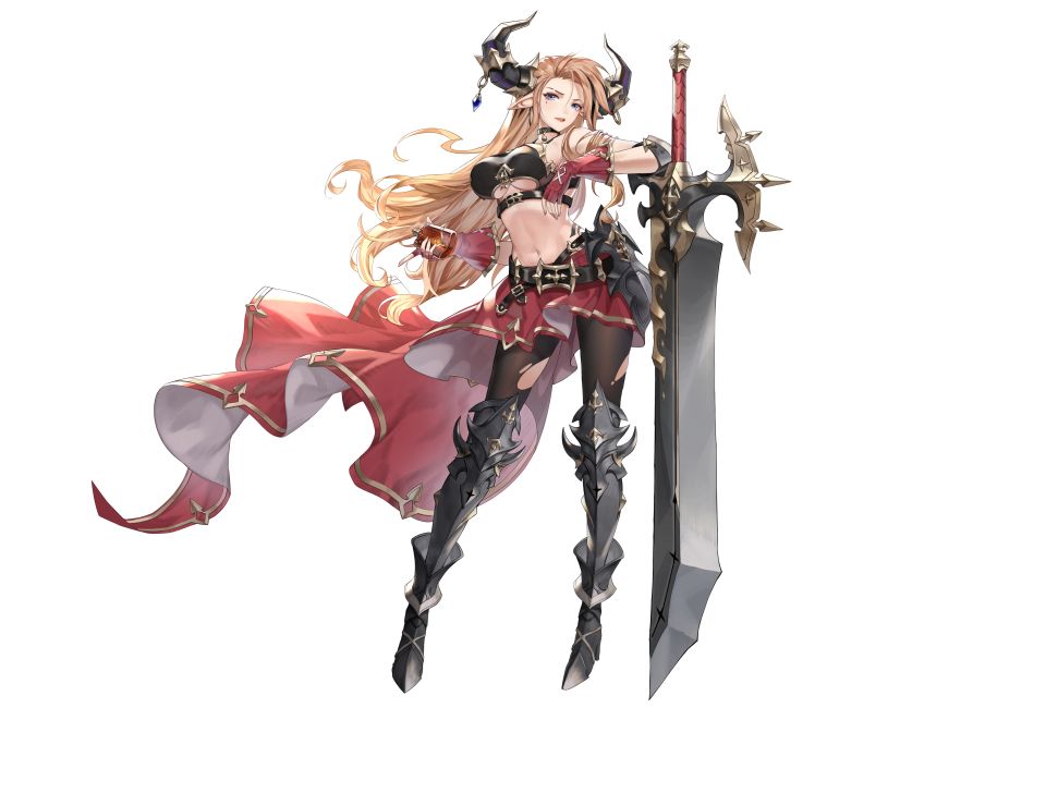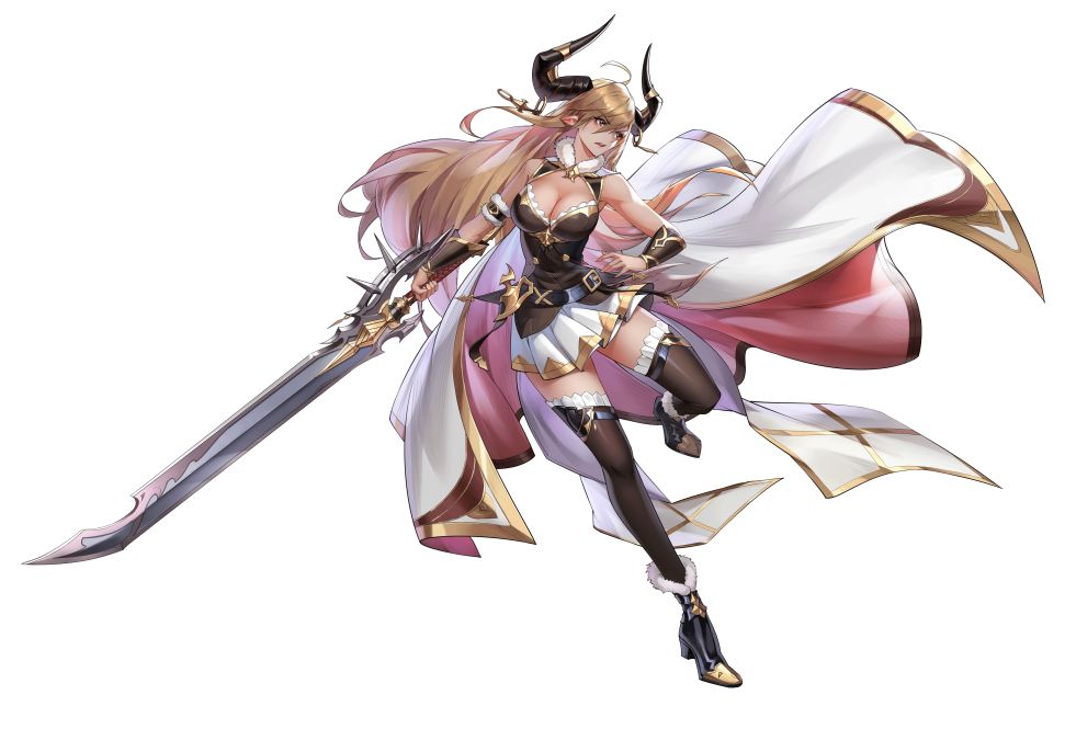第三版的她已是身经百战、所向披靡的女英雄,在气质上多了一分“傲气”:与她一般高的大剑插在身旁,她侧身倚靠,轻蔑又颇有挑衅意味地看着的敌人。