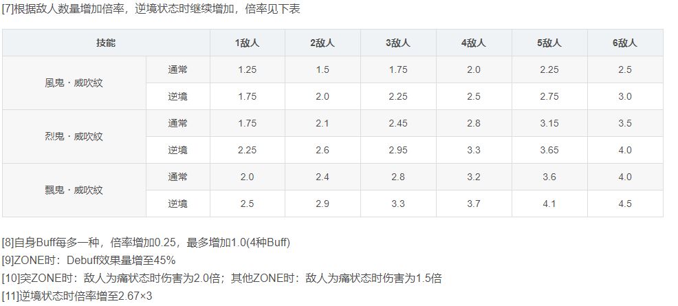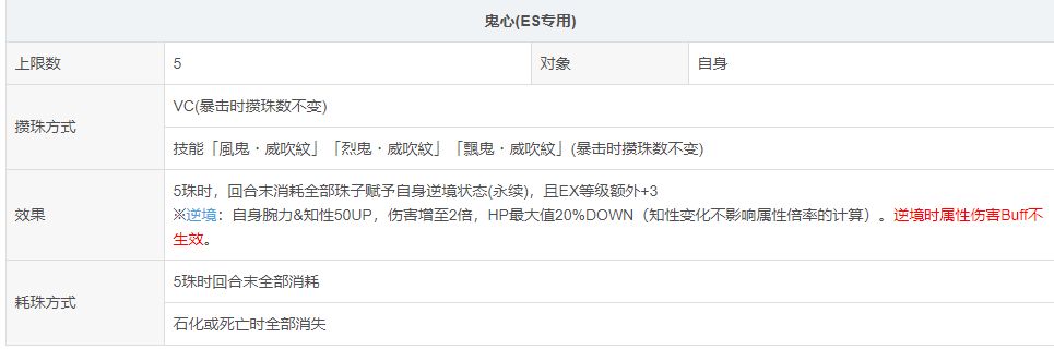 逆境:自身腕力&知性50UP,伤害增至2倍,HP最大值20%DOWN(知性变化不影响属性倍率的计算)。逆境时属性伤害Buff不生效。