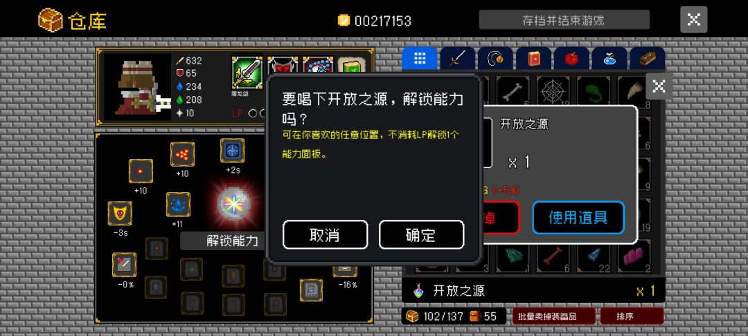 大概是通过第二个还是第三个boss?刷出来的新城镇“地图左边是矿坑”,这时候可以在地图左上角补给商店兑换镐子,拿到镐子之后可以破坏地图右下的方块,破坏后就可以把那个箱子推过去填坑了。然后开箱获得的“开放之源”效果如下