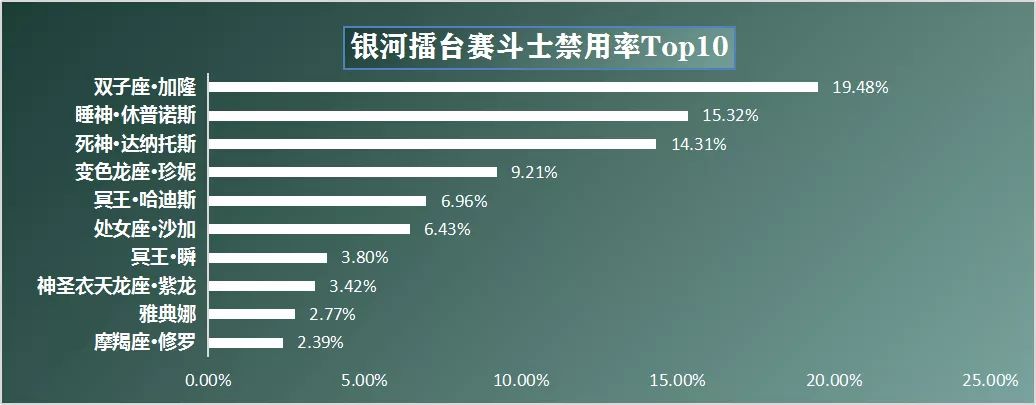 本期禁用榜单较上周变化不大,双子加隆依旧稳居榜首,而在赛季初单Ban模式中大家还是比较喜欢禁用敌方死神,上阵沙加阵容。