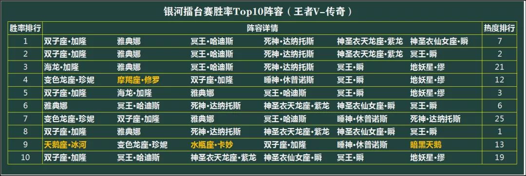 银河擂台赛胜率Top10阵容(王者V-传奇)