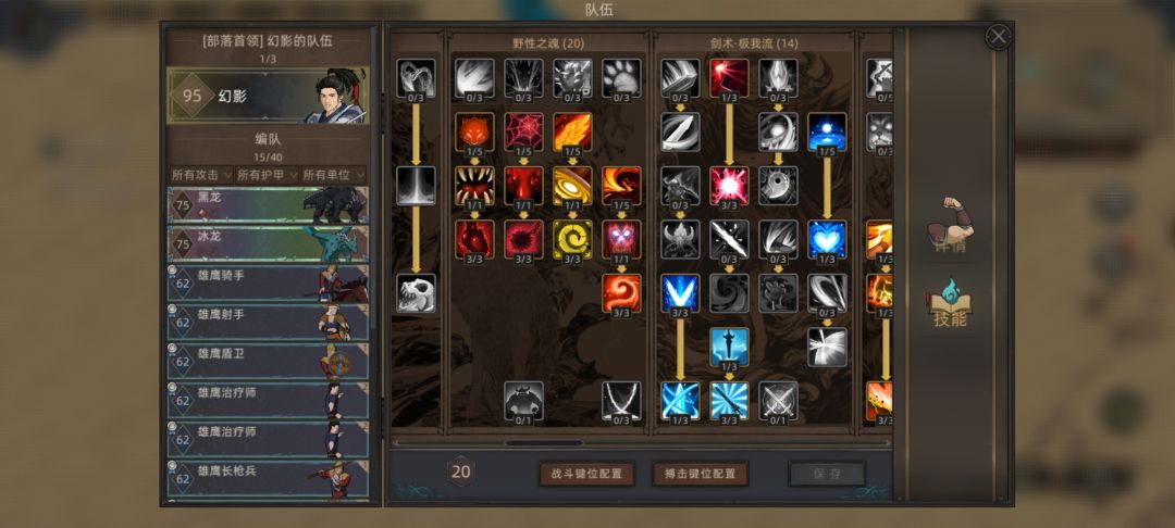 开始啥技能都不点带加血药,打一级兽穴(红石城那个)打完就到6级,蜘蛛那一排各加一级,能加鹰的时候也各加一级,点最好存着如果有差点打过没打过的,点剑豪的中间那俩各一级这个后期必点的