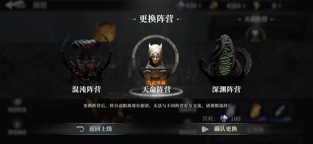阵营的话推荐选择天命或者混沌,深渊奖励对半不如单搞一个,阵营选择后就是对于boss被击败后选择救赎还是献祭,关系到获取奖励代币加成,代币兑换商店装备还是很关键的,阵营对应选择如下: