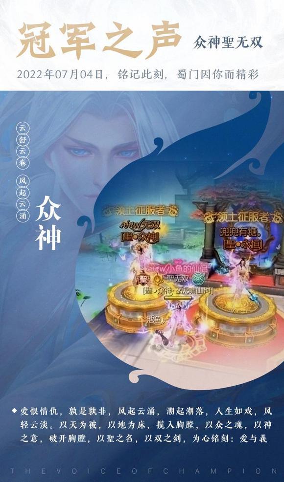 帮会取得这么好的成绩离不开所有帮会成员的支持、团结和配合,还有无惧的指挥。希望我们云天圣域帮会越来越强大!蜀门手游越办越好!