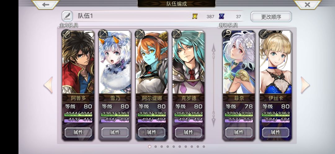 阵容如下,后排菲奈和AS会长是经验宝宝,中途的小怪阿鲁多带亚空剑都可以一个技能击杀,魔兽妹和克罗德打潜解痛灵晶上痛