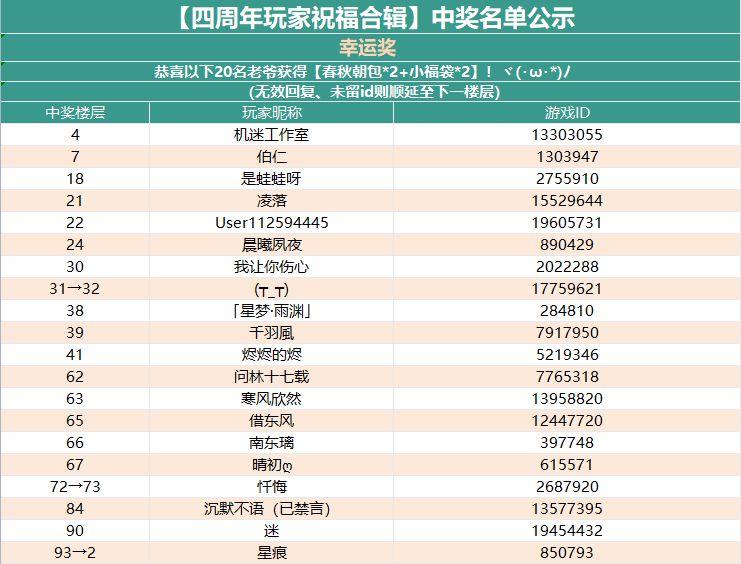 在本帖下方评论一句周年祝福,并留下您的游戏性ID我们将从回帖楼中抽取 20名 幸运儿,送出【春秋朝包*2+小福袋*2】的奖励