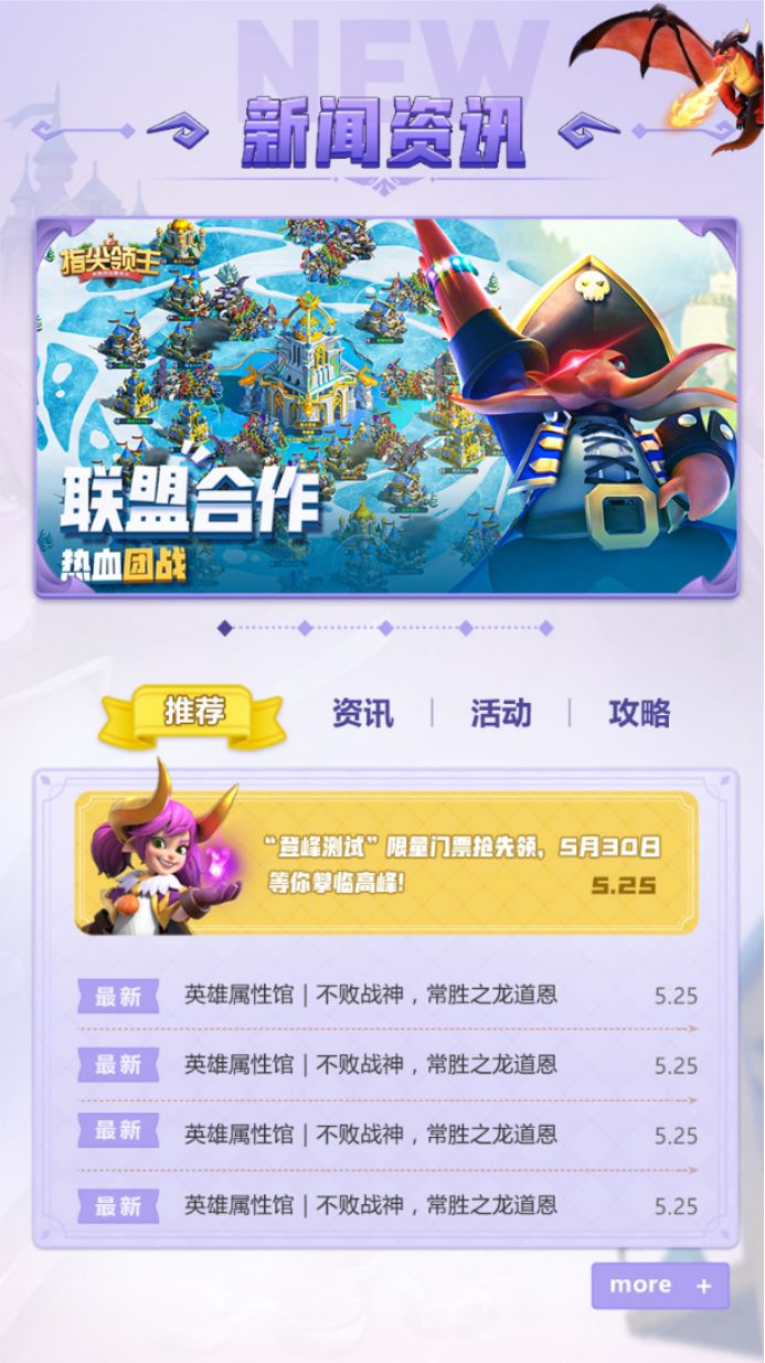 “推荐”、“资讯”、“活动”、“攻略”四大板块各司其职,领主大人可以第一时间获取最权威的游戏资讯。