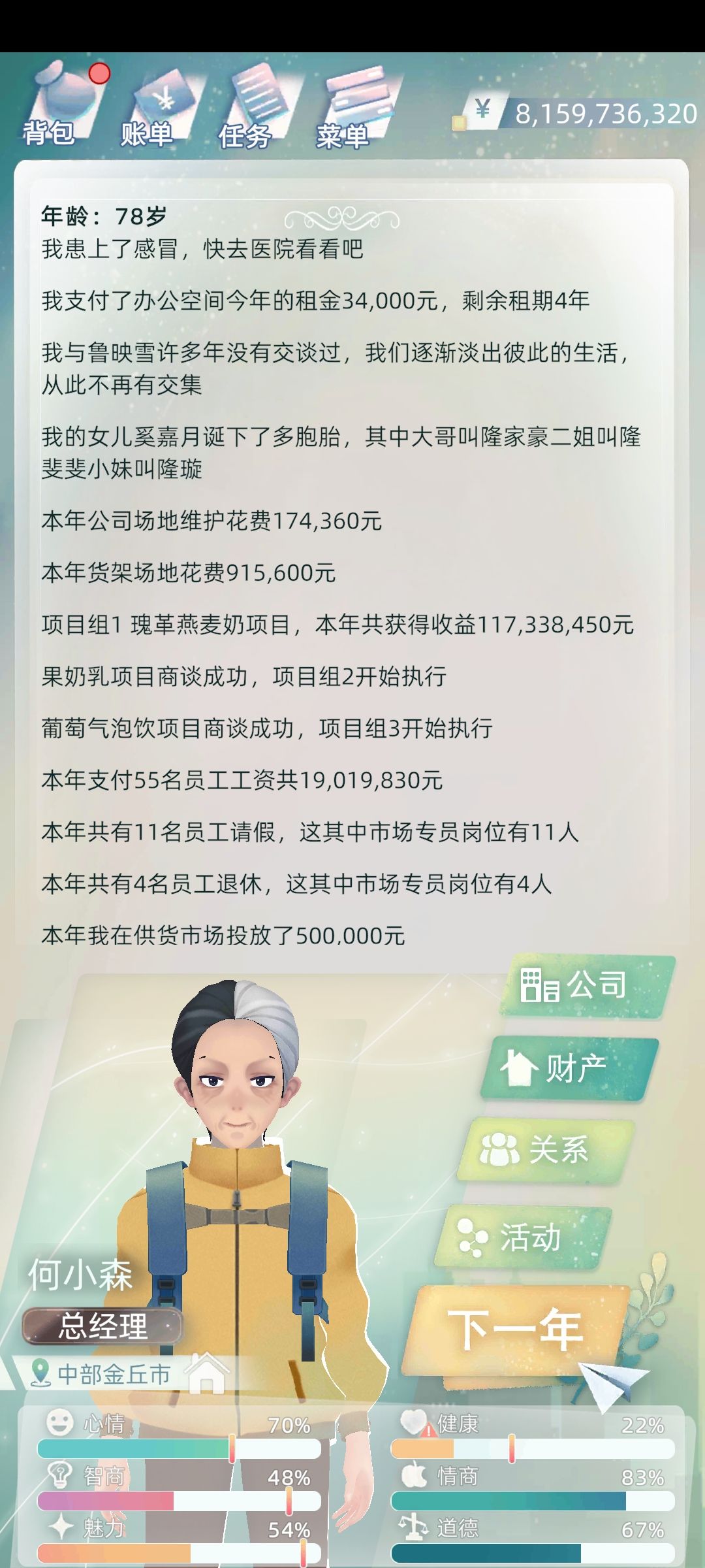 2.5 总经理:开公司后成为总经理,攻略其实游戏里有介绍,投入一亿公司直接拉满也能撑到盈利。这是游戏第二挣钱的方法。副总经理给继承人,继承人可以继承公司,如果给继承人的父母,直接选择继承人的话公司会直接消失。