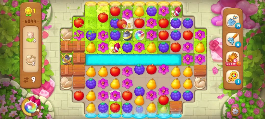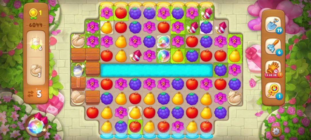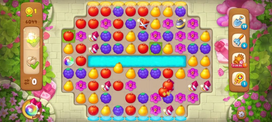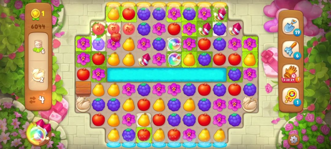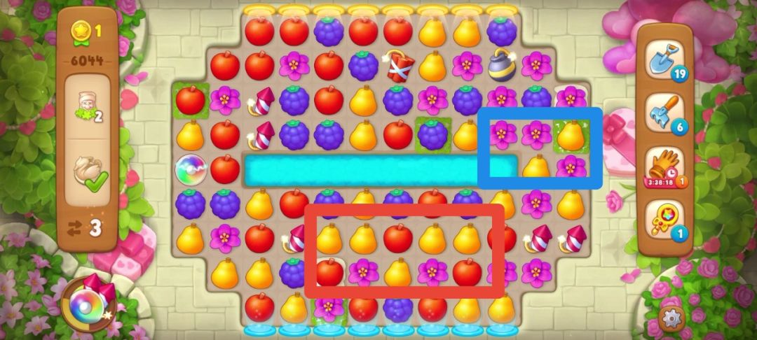 花了三步我手机到所有天鹅雕像,小矮人也只剩最后的两个,如下图,蓝色框住的地方可以直接匹配花朵收集到小矮人,红色框住的地方是匹配梨能制造一个炸/弹,由于下方的小矮人不能通过匹配元素直接收集,只能先制造炸/弹再用它收集!具体操作如下,惊险通关~