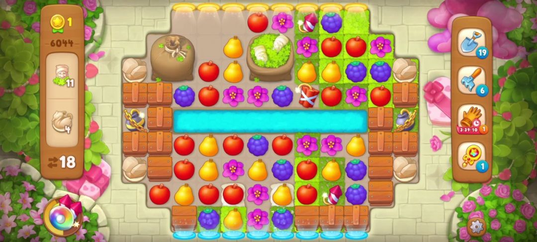 接着我就把剩余的落叶袋打开,小技巧:一般有传送带的关卡,最好在传送带下方匹配,运气好掉落的元素不仅能清除障碍还能合成道具!我花了5步打开了最右边的落叶袋,同时中间的落叶袋也只用匹配一次就能打开!(如下图)