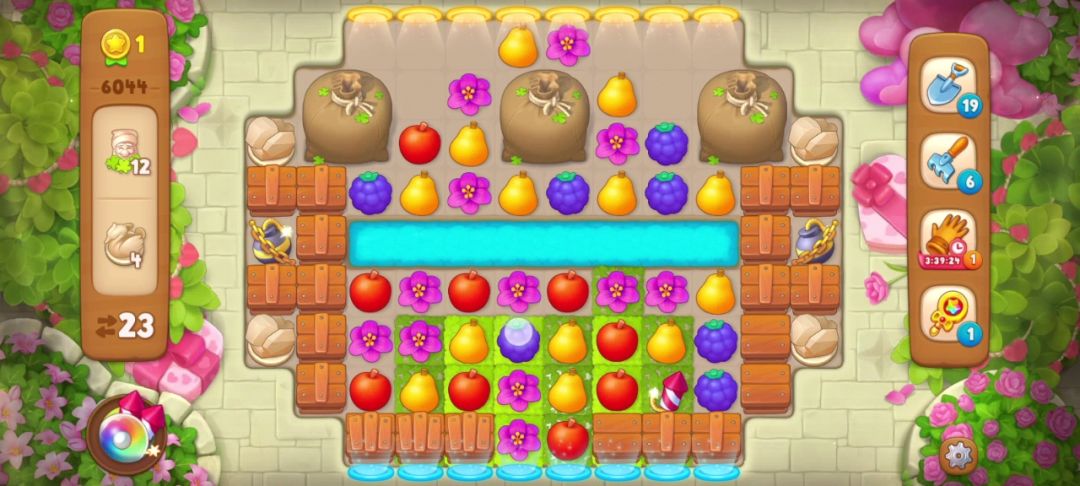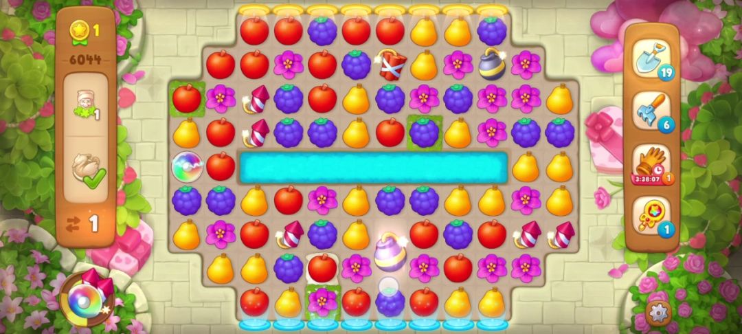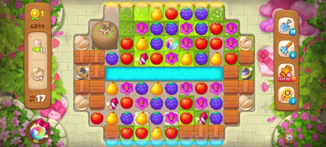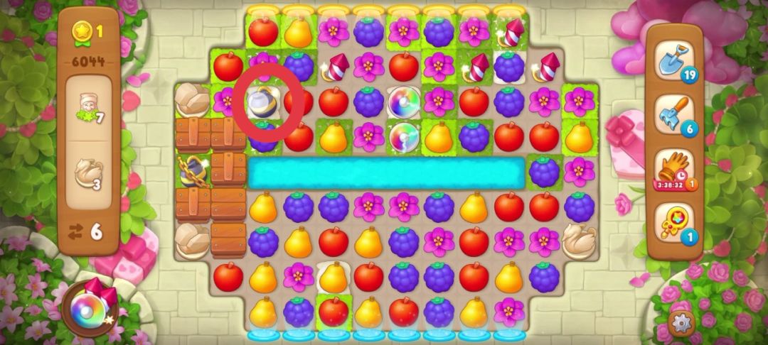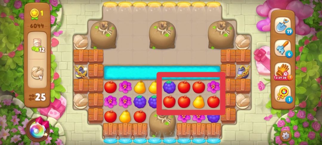 2、具体步骤:落叶袋需要三步才能释放出来小矮人,但是注意看开局用红色框住的地方(如下图)匹配苹果可以制造一个火/箭,并且掉落下来的葡萄还能在落叶袋上再匹配一次,所以我只用两步打开了最下方的落叶袋(如下图)