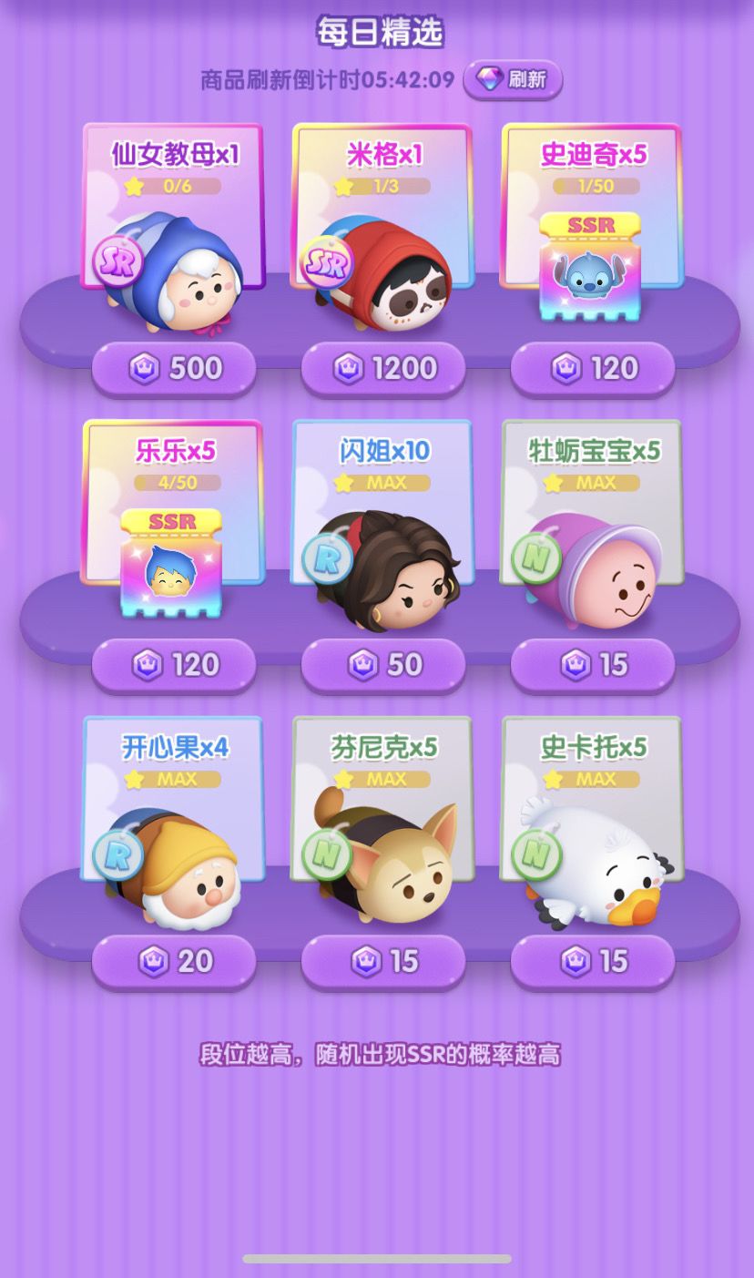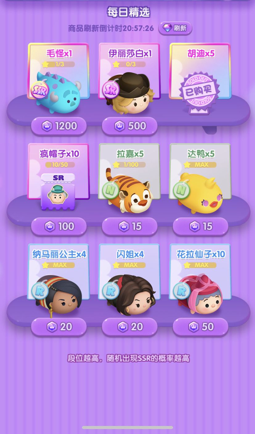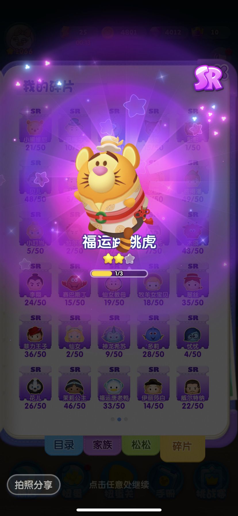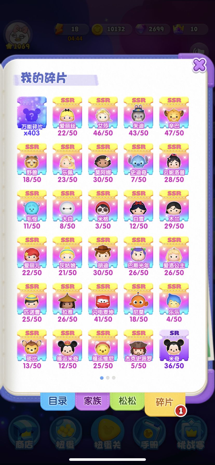 4日份的SSR碎片:爱丽丝x2、艾莎x1、朱迪x5、辛巴x2、野兽x1、云妮x1、史迪奇x6、毛怪x4、莫阿娜x1、米格x1、拉雅x1、胡迪x5(商城兑换)、巴斯光年x1、闪电麦昆x1、爱洛x1、匹诺曹x1