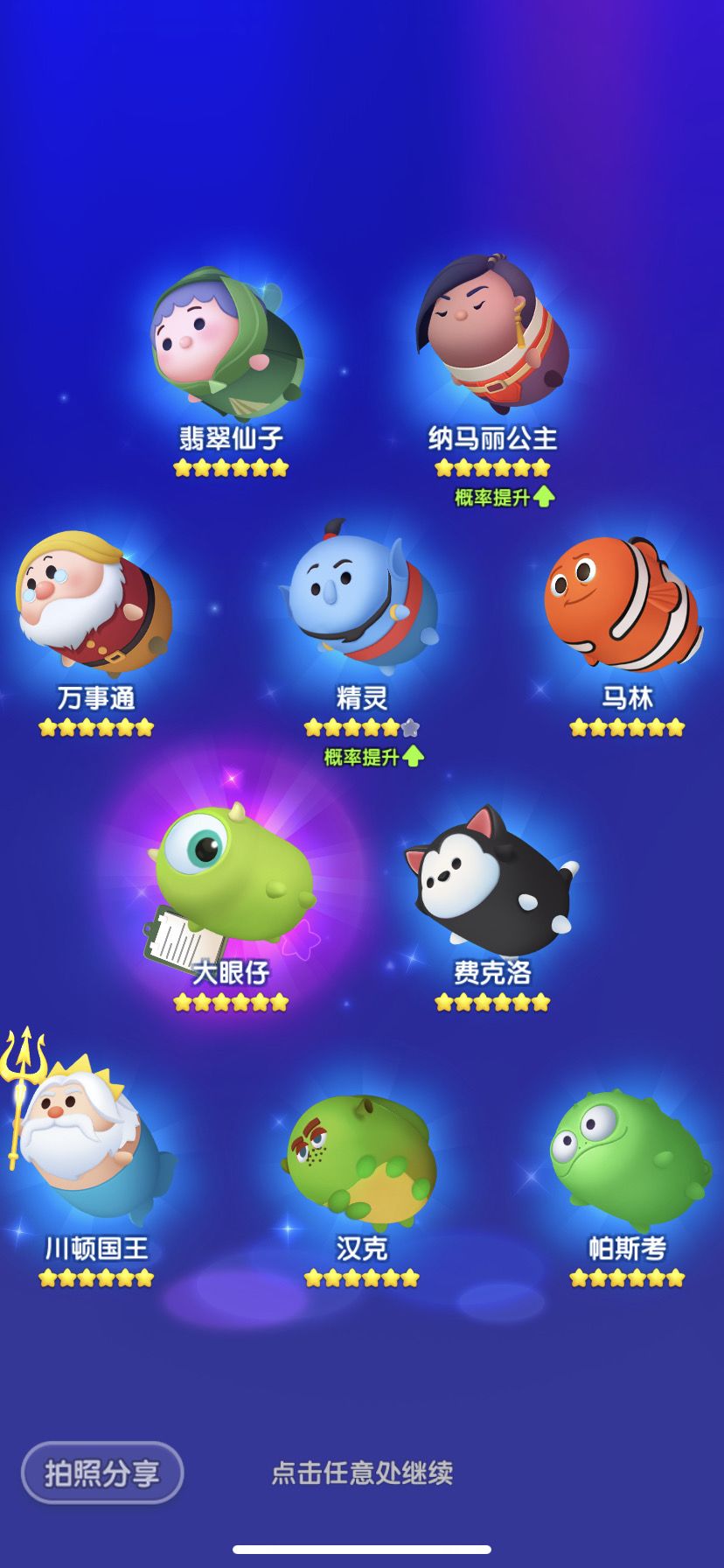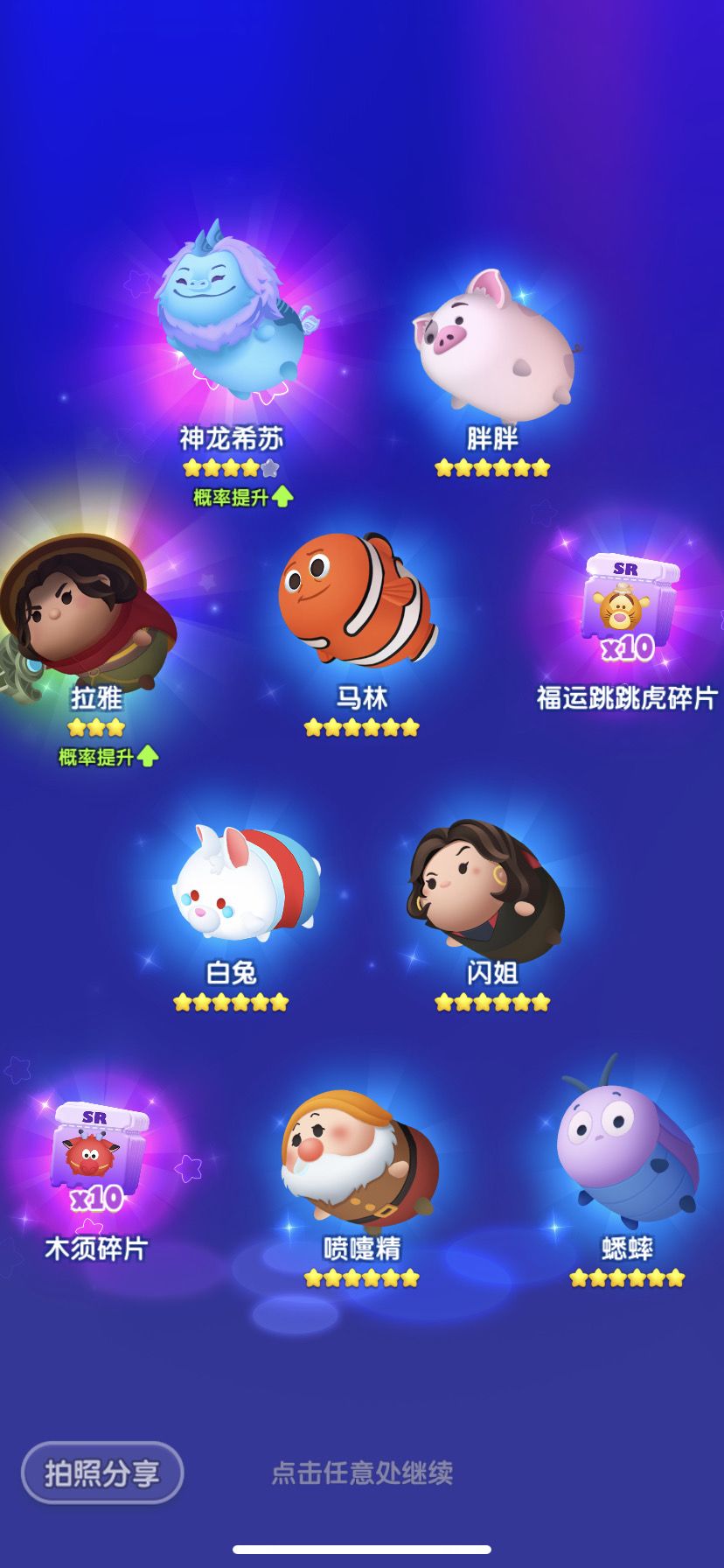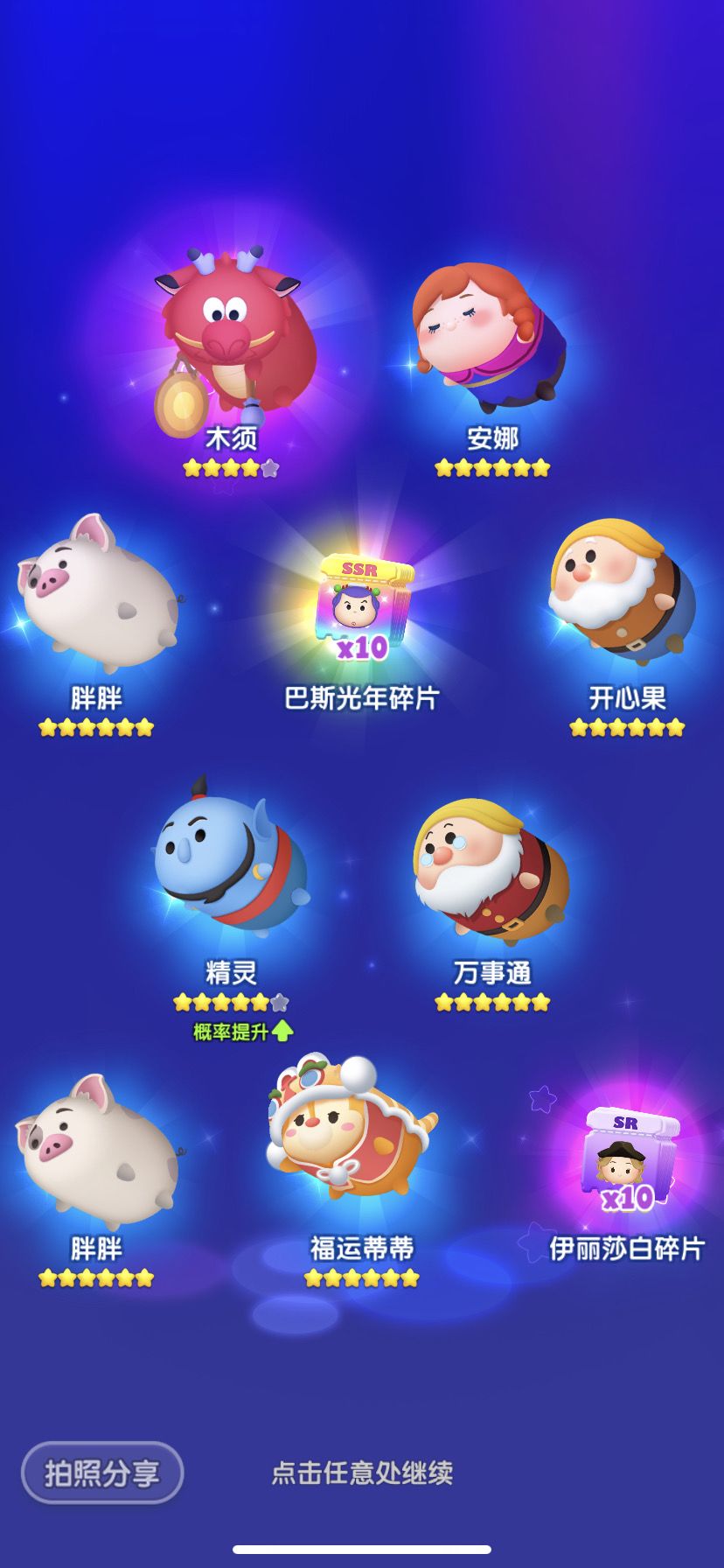 4日份的SSR碎片:爱丽丝x2、艾莎x1、朱迪x5、辛巴x2、野兽x1、云妮x1、史迪奇x6、毛怪x4、莫阿娜x1、米格x1、拉雅x1、胡迪x5(商城兑换)、巴斯光年x1、闪电麦昆x1、爱洛x1、匹诺曹x1