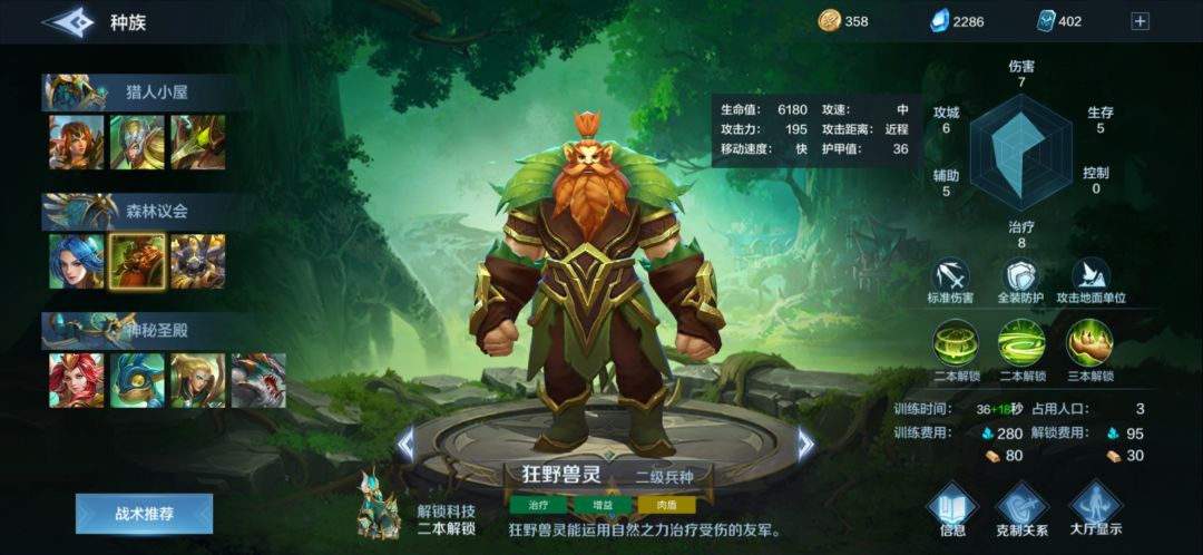 狂野兽灵:是我上一版着重给大家推荐的兵种,但是有一个很严重的问题,他打不了人族,破法可以偷到回复,战舰魔法伤害直接秒他,同样他攻击力也不高,是不好秒后排的,跟骑士差远了