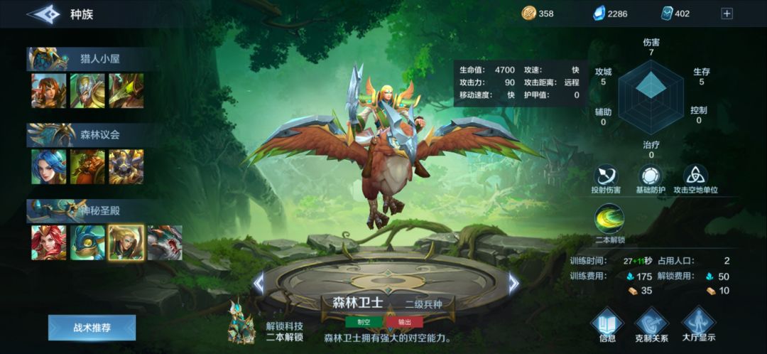 森林卫士:4700的血量,战舰是7840,攻击也差了不止一个档次,几个战舰集火就没了的东西,但是,如果绕后绕好了,这个东西对空军还是比较有针对性的,90×625%的标准伤害还是可观的,就是太脆,集火一下死一下,且对空为标准伤害,非投射。