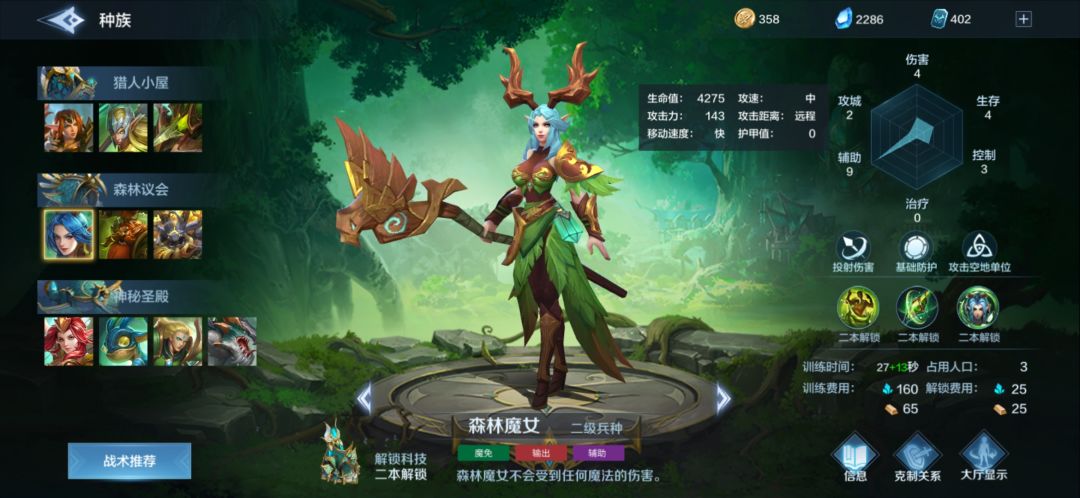 森林魔女:森林必出兵种,没有森林魔女的你只能去对面家跟对面打,因为森林没有任何减速,只能依靠魔女控制,但是有一个严重的问题,基础防护,且只有4275的生命,143的攻击力,大家可以对比一下小炮的数值,再对比一下生产速度(小炮少三分之一的时间),同样的射程,大家觉得互点谁更有优势,当然,会有人觉得魔女是个辅助,那么请问,如果魔女是类似于法师的辅助,森林靠什么输出?龙骑?大树?还是兽灵?再加上现版本蛮族都用的狼骑,魔女变一个死一个,难受。
