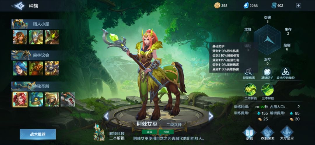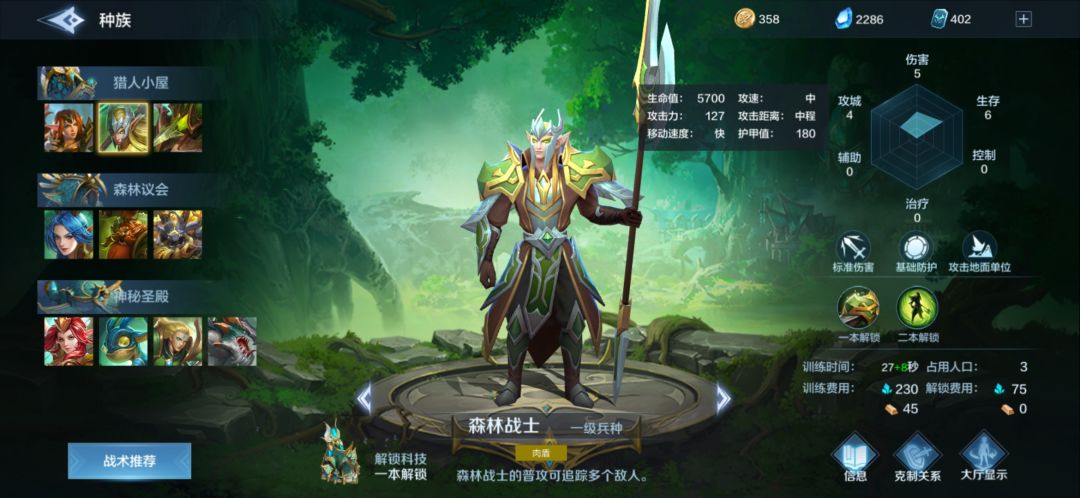 森林战士:版本陷阱,但是又是很多森林不得不出的兵种,为什么,因为虽然他血量高,虽然他技能免伤,虽然他是个半远程,虽然他护甲高,但是,他是基础防护,受到210%的投射伤害,蜘蛛,弩手,小炮恰恰又都是投射伤害,230精矿一个的性价比仅仅是撑过前期