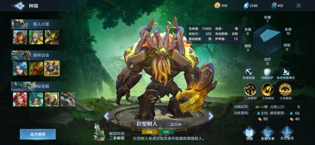 巨型树人:又回到了那个问题,树人出不出,打森林帝国必须得出,是他强吗,格局小了,你可以看看四战舰的威慑力和四树人的威慑力,更别提树人的建造时间比战舰多3秒,科技时间多11秒,贵60精矿,更别提树人的留人能力了,几乎没有。那么森林就面临一个中级问题,别人绕过你的树人怎么办!如果你想用魔女留对面后排,树人打伤害,那你魔女就在对面后排脸上,点你点的没有脾气的,如果你的树人只抗伤害打乱阵型数量少又不够,爆起来还很花时间,也很贵。树人移速很慢追不上造成不了击杀是硬伤。