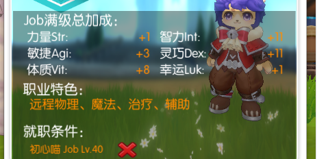 人类职业花88猫币购买猫分支后,JOB等级锁定上限10job等级,但是转职术士需要初心猫40job等级,无法转职。