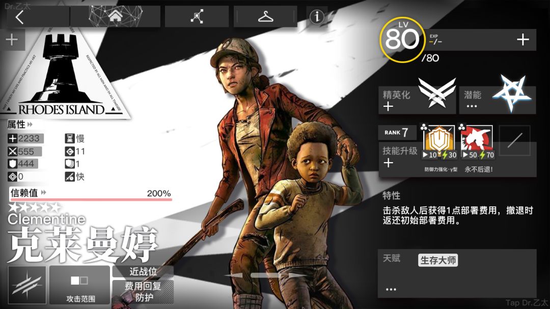 克莱曼婷是游戏《行尸走肉》系列里的主角小女孩,第一季初登场时为一年级小学生。《行尸走肉》是一款根据大热漫画以及人气美剧改编的恐怖生存互动电影游戏。现已在博士的邀请下与AJ一起加入罗德岛。