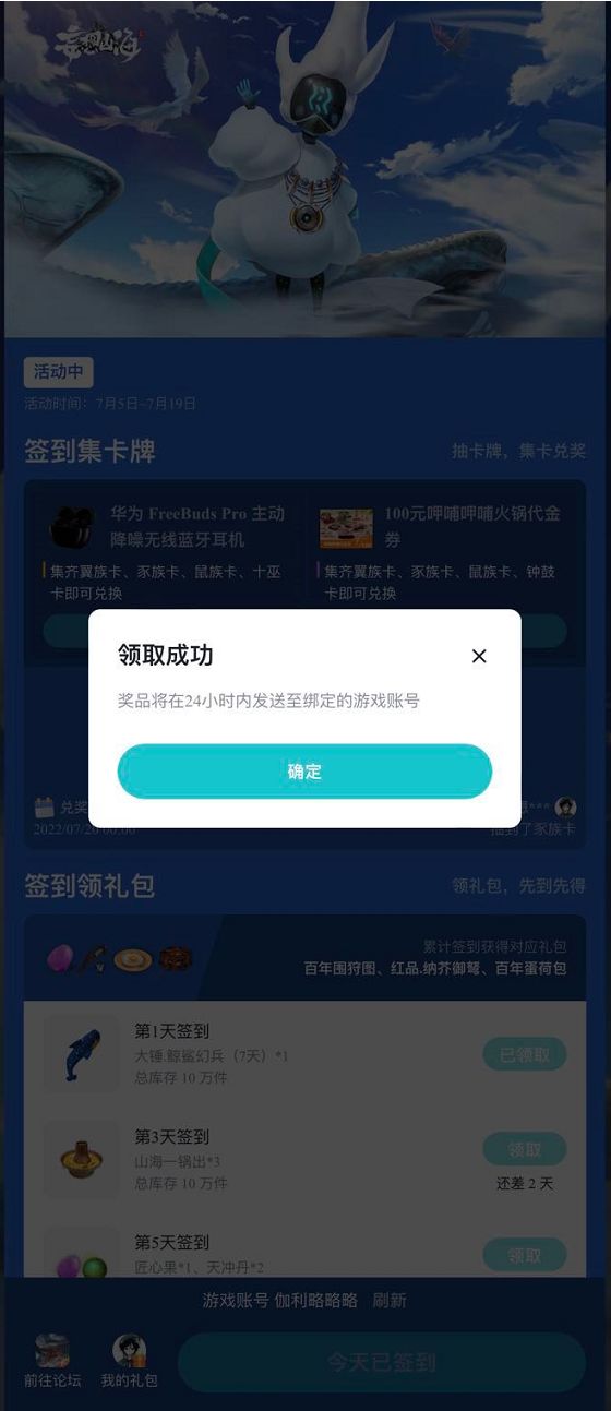 2022年7月5日-7月19日,前往签到页面 点击【立即签到】,活动期间内累计签到即可获得对应天数礼包!百年围狩图、红品.纳芥御弩、百年蛋荷包等各种超值道具等你领取,旅者们千万不要错过!