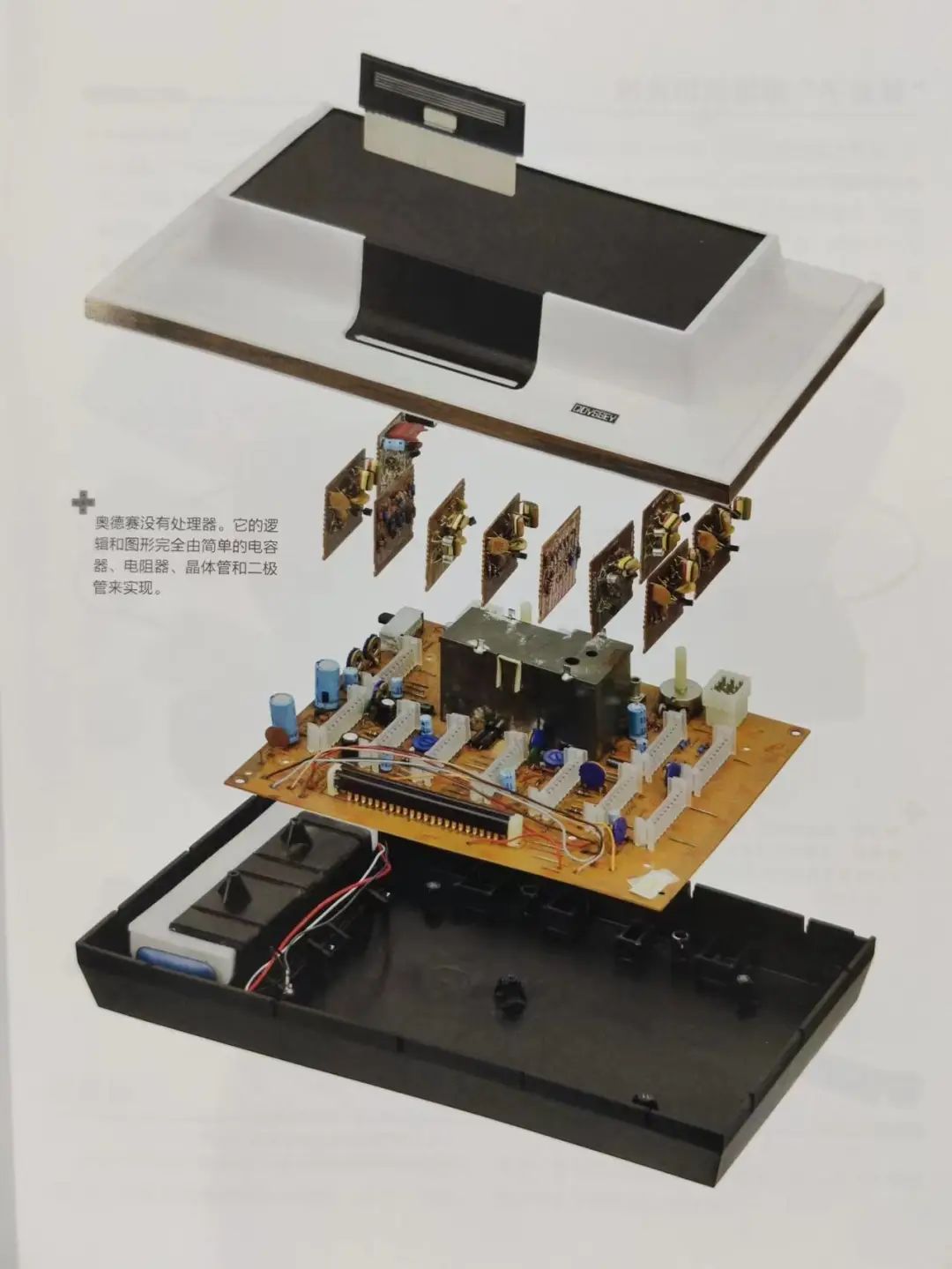 很难说第一台游戏机诞生于什么时候,至少1972年发售的「米罗华奥德赛」被《游戏机图鉴》选为了第一世代的起源。早期的游戏机更像电视的配件。它们没有复杂的功能,没有处理器,甚至只有一款游戏,电路板也仅由电容器、电阻器、晶体管和二极管组成。