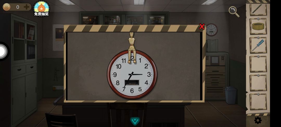左侧墙下方木偶图案 结合取餐楼左侧木偶图案得监控室右上方钟表密码(如下图)得半截钥匙