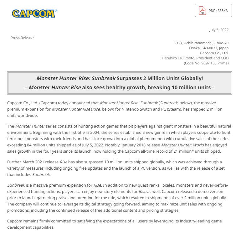 卡普空今日宣布,《怪物猎人 崛起》全球销量已突破1000万份,DLC曙光销量突破200万份,系列累计销量也达到8400万。