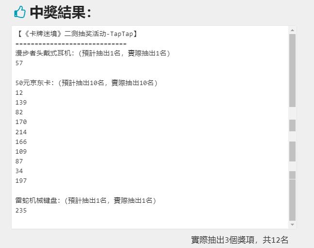 以下为《卡牌迷境》第二次测试抽奖活动TapTap中奖名单及抽奖凭证: