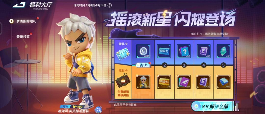 解锁后首日即得雇佣兵·街头摇滚套装,第5天还有60钻石等你来领!