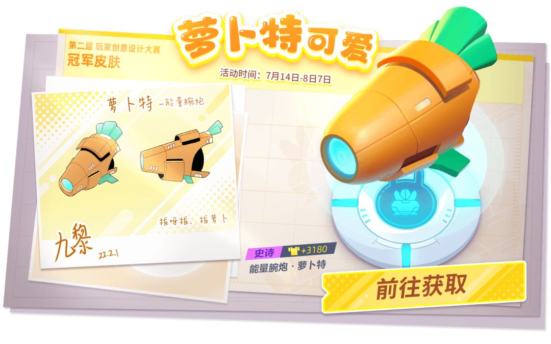 活动期间,少年们可以购买武器卡皮肤设计大赛巨星奖皮肤——【能量腕炮·萝卜特】!